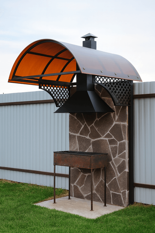 Изготовление навеса для мангала. На этом этапе подбираются материалы: металл, дерево или их комбинации. В качестве покрытия используют металлочерепицу, поликарбонат или профнастил, устойчивые к перепадам температур.